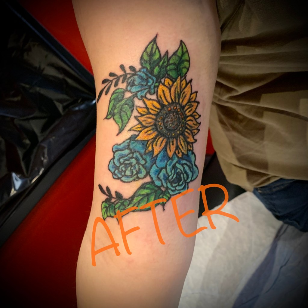 My client wanted her old tattoo on her inner bicep covered up before her wedding. She was to wear a sleeveless gown and needed something blue. The sunflower and three blue roses had special meaning to her. I used thick black outlines and bold solid colours to cover the previous work.