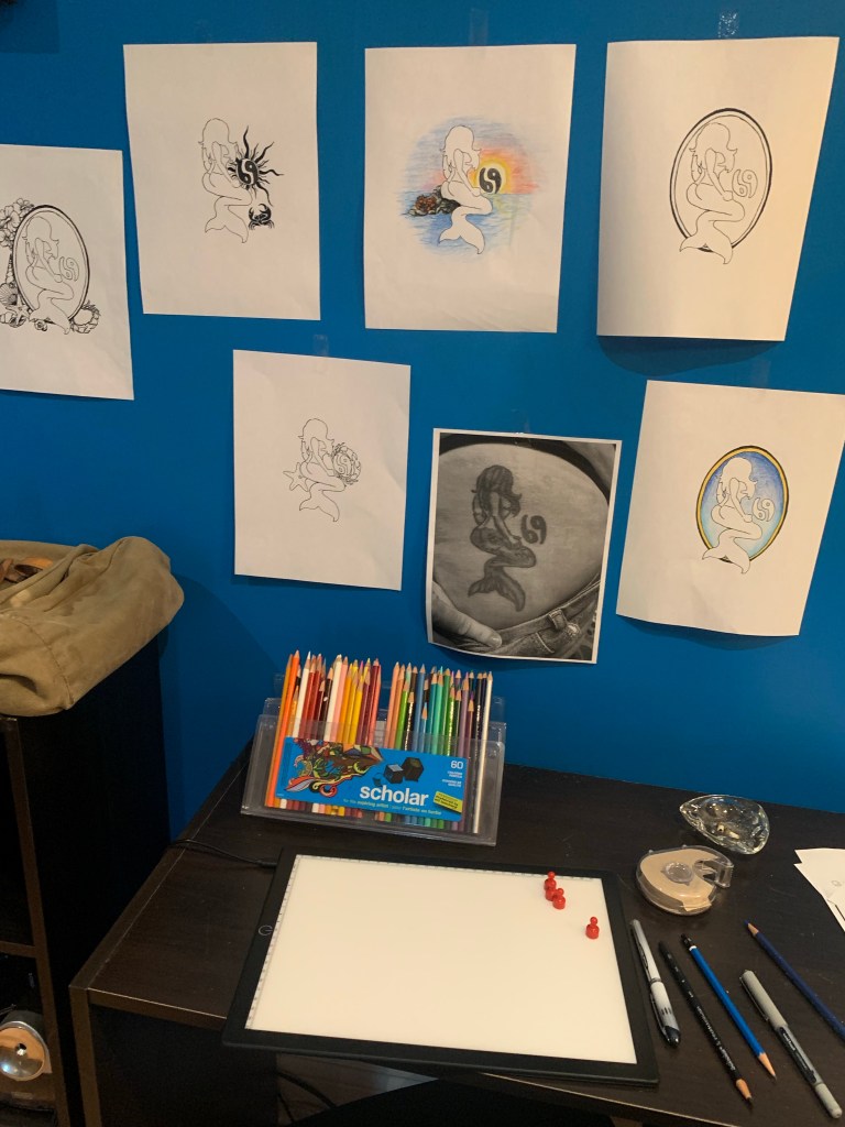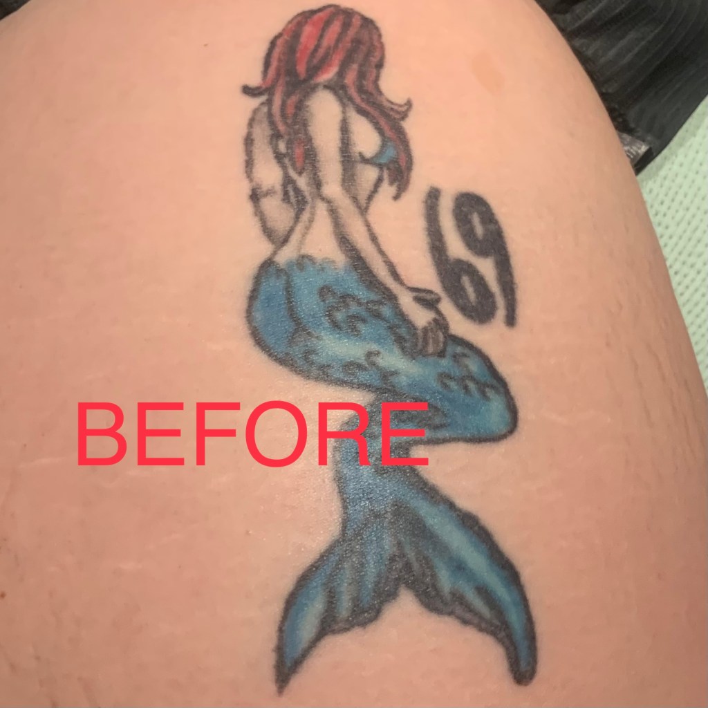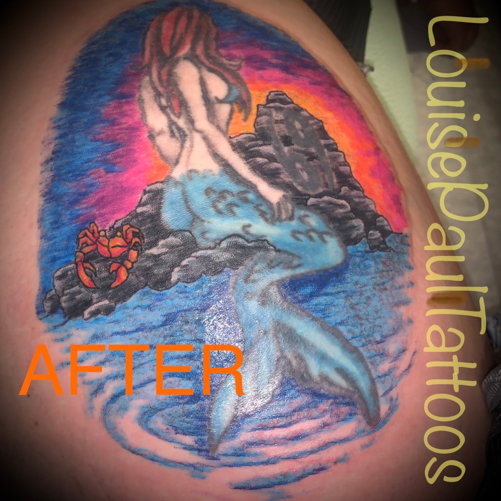 On this one, my client wanted me to rework her old mermaid tattoo. She wanted to keep everything as is, as to not destroy the memory of the tattoo experience, but wanted to hide the cancer symbol of 69 and incorporate the cancer symbol of the crab into the design. I sent her several design options and then combined a couple designs together to get exactly what she wanted.